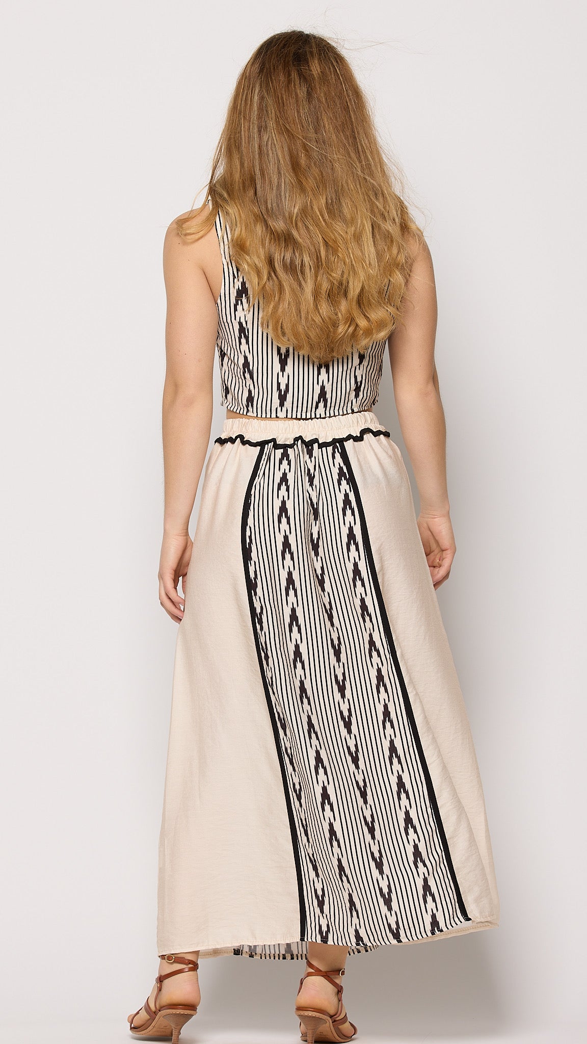 Conjunto de falda y blusa. Su tejido ligero y fluido realza la silueta con naturalidad. Es. un look veraniego que no pasará desapercibido. ¡Será tu imprescindible del verano!